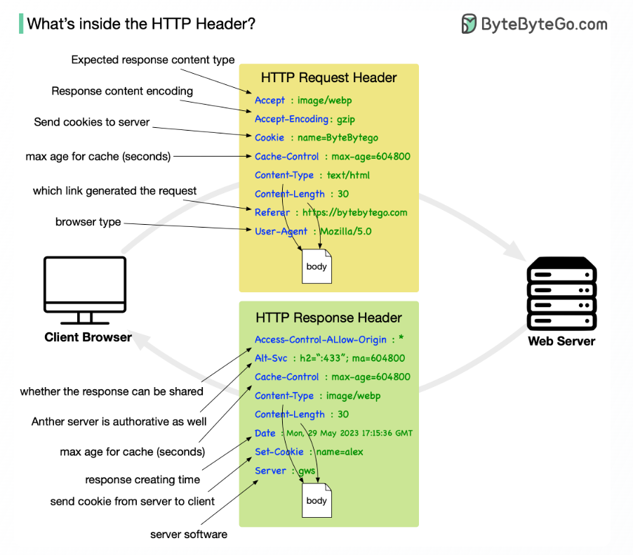 - ํค๋๋ ํด๋ผ์ด์ธํธ์ ์๋ฒ๊ฐ ์์ฒญ ๋๋ ์๋ต์ผ๋ก ๋ถ๊ฐ์ ์ธ ์ ๋ณด๋ฅผ ์ ์กํ ์ ์๋๋ก ํด์ค.